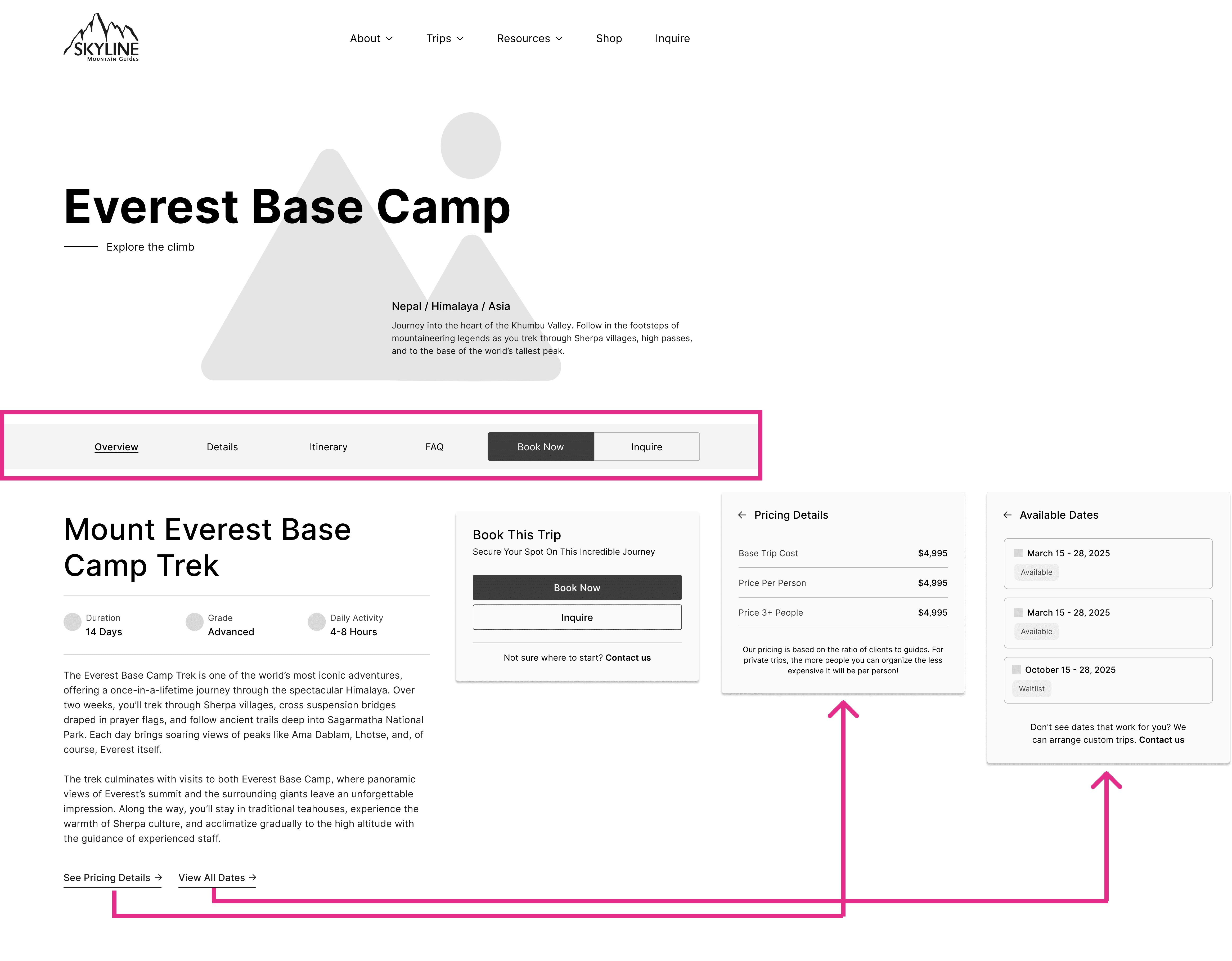 I created a CMS-driven trip template with a booking panel for group/private options, pricing, and dates, plus a sticky sub-nav that organizes the full trip details into clear sections.