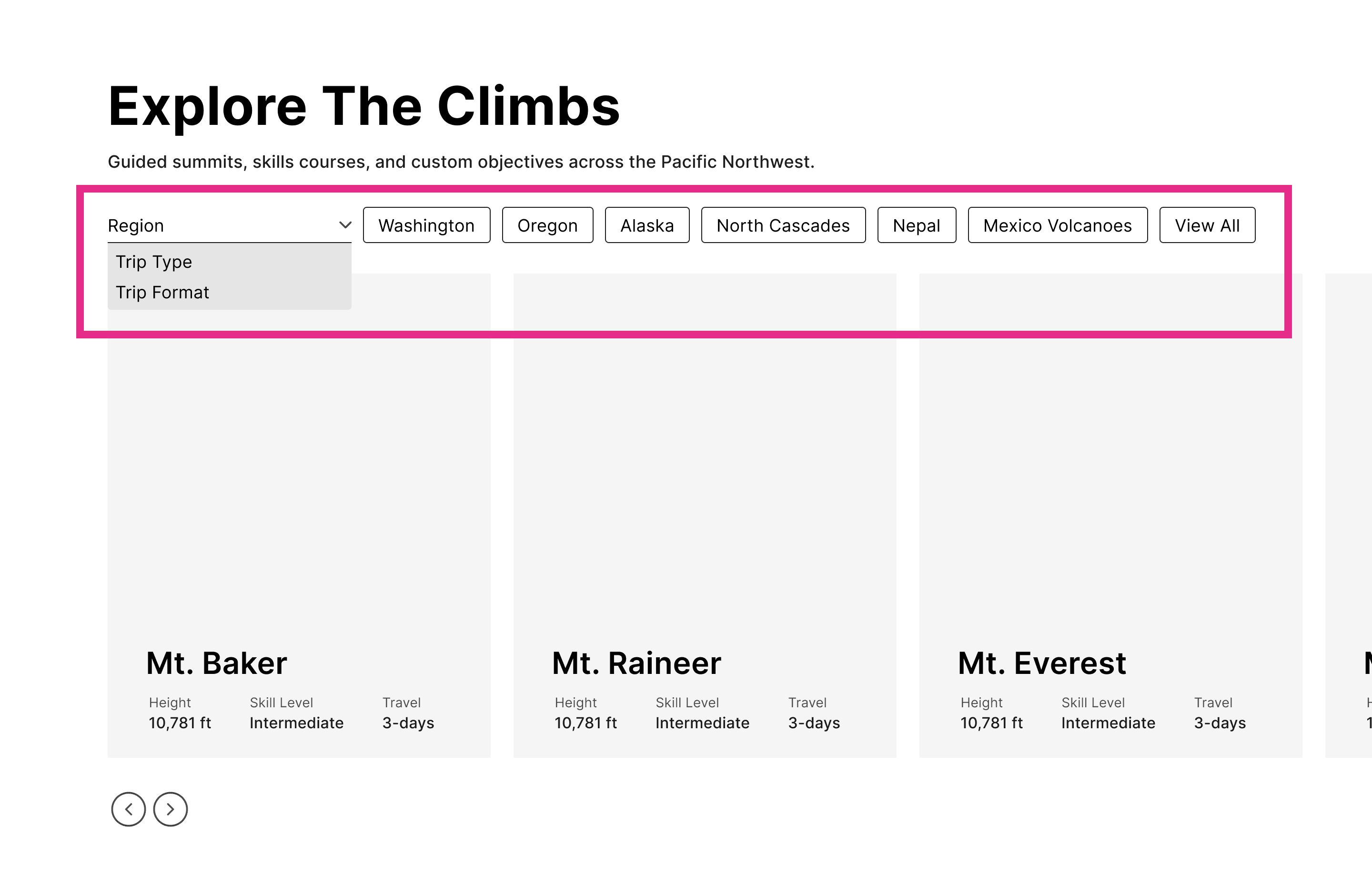 Solution: I wireframed a category-driven discovery experience, including a homepage trip module and region + trip-type organization across the site, so users can explore naturally and find the right trip faster.