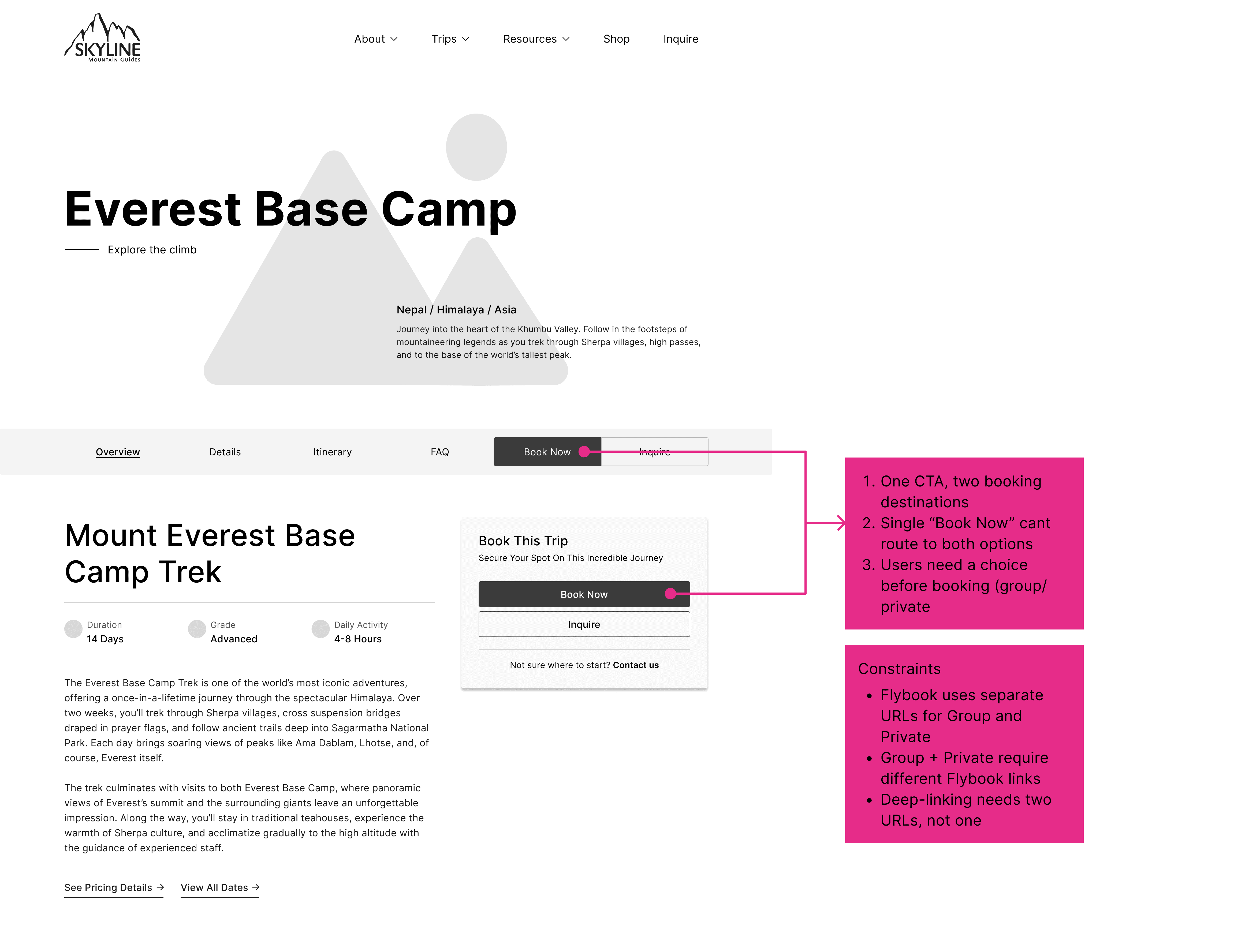Problem: Annotated wireframe showing the booking handoff constraint — a single CTA needed to route to two separate Flybook destinations.