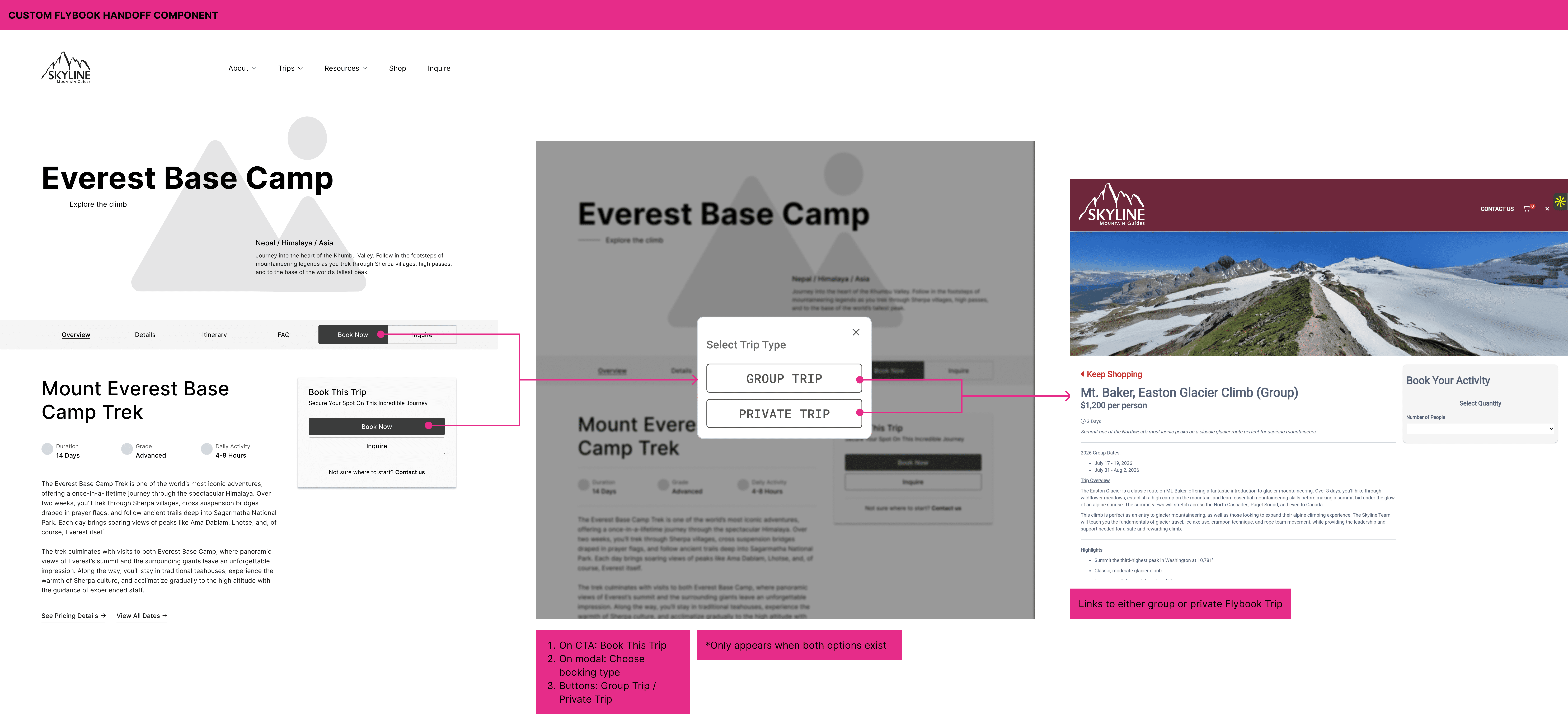 The trip detail template could display both group and private options (pricing and dates), but it only supported one clear "Book Now" action. That exposed a real constraint: Flybook treats group and private trips as separate entries with separate URLs, so a single button couldn't reliably deep-link users to the correct checkout.